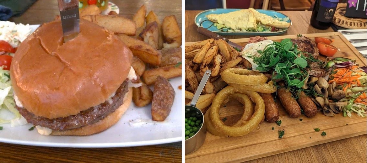 Pembrey Country Inn offers a diverse menu that includes pub meals, burgers, pastas, and vegetarian options, totaling 62 different dishes.